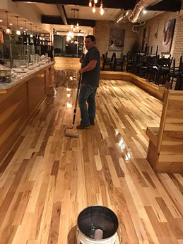 YOLK Restaurant Downtown Chicago, IL - dustless floor refinishing - applying the first coat of finish