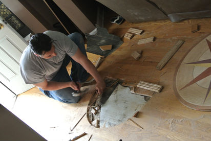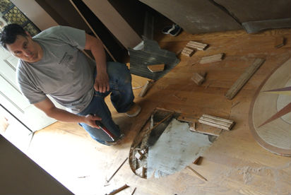 New wood is placed around the medallion weaving it in with the existing floor to insure a perfect fit and seamless design11