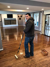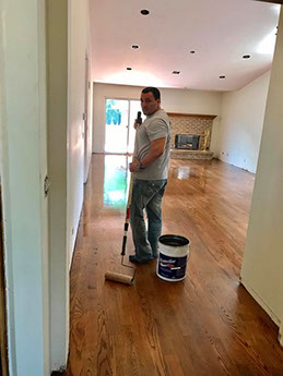 Dynasty Banquets: water damage repair and refinishing of dance floors - applying the first coat of finish after sanding
